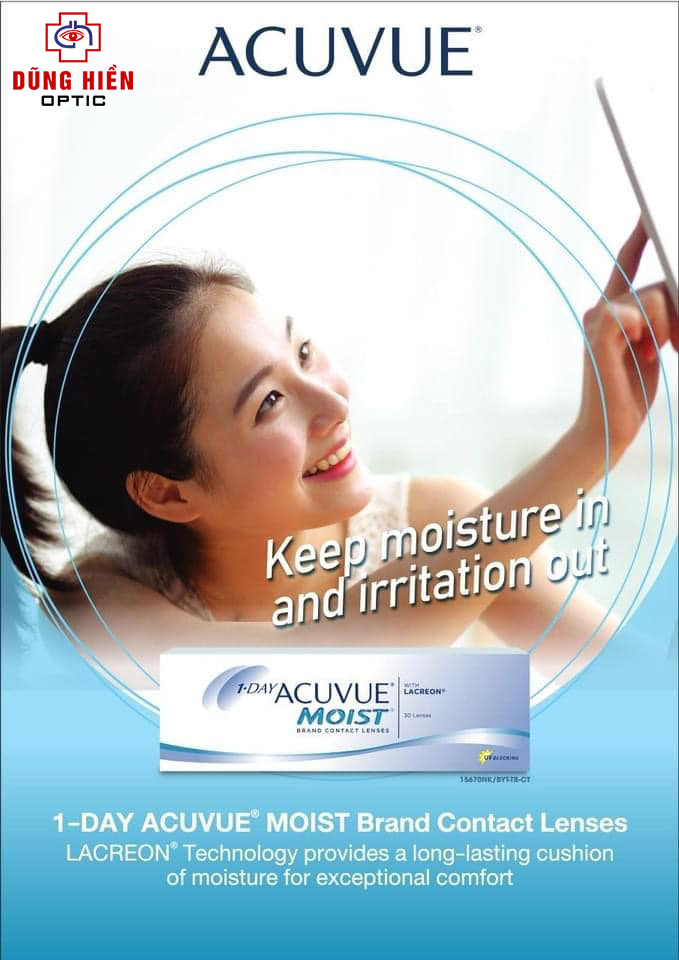 Lacreon - Công nghệ LACREON của Acuvue sử dụng chất làm ẩm, giàu độ ẩm để giữ nước vĩnh viễn trong kính áp tròng. Một cách hiệu quả, nó bắt chước tác dụng mà nước mắt của bạn sẽ làm cho mắt bạn ướt. Công nghệ này giữ cho đôi mắt của bạn ẩm suốt cả ngày và cho phép thấu kính lướt trên bề mặt mắt của bạn, đảm bảo thấu kính được đệm và thoải mái khi đeo.