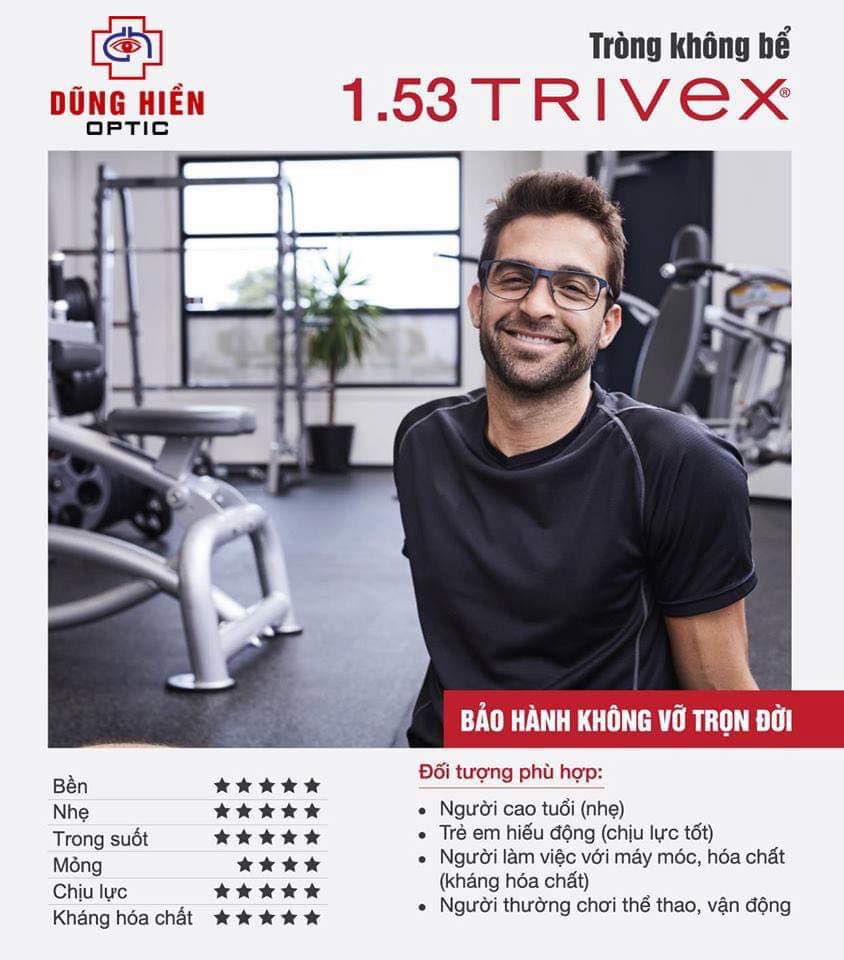Trivex đều có đặc điểm ưu việt là nhẹ và mỏng hơn các loại kính nhựa thông thường. Hơn nữa, chúng còn có khả năng bảo vệ đôi mắt 100% do các tác động có hại của các tia cực tím từ ánh sáng mặt trời, thậm chí chúng còn có khả năng chịu ngoại lực tác động gấp 10 lần so với các loại tròng kính làm từ thủy tinh hay nhựa Plastic khác.