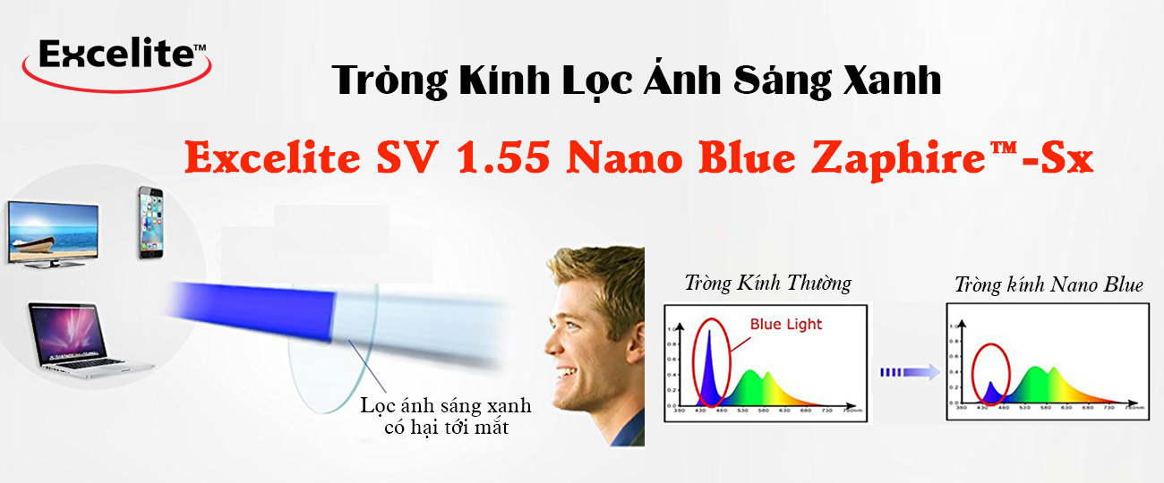 Tròng kính EXCELITE 1.55 NANO BLUE - Bảo vệ an toàn đôi mắt bạn trong thời đại số .