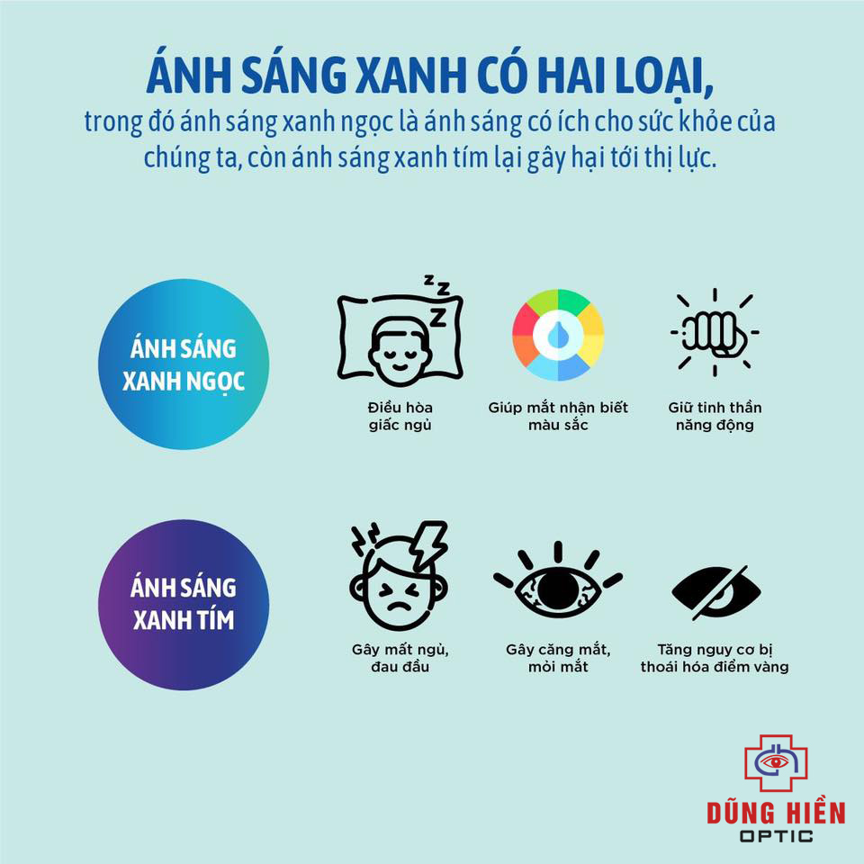 - Ánh sáng xanh tím gây hiện tượng mỏi mắt, đau đầu và là nguyên nhân dẫn tới bệnh thoái hóa điểm vàng ở tuổi già.